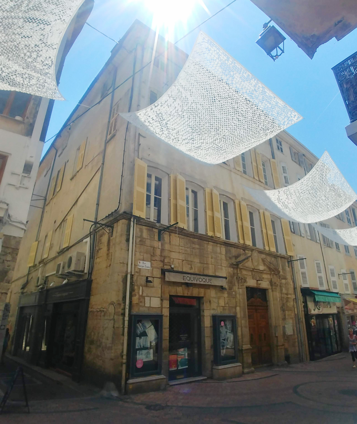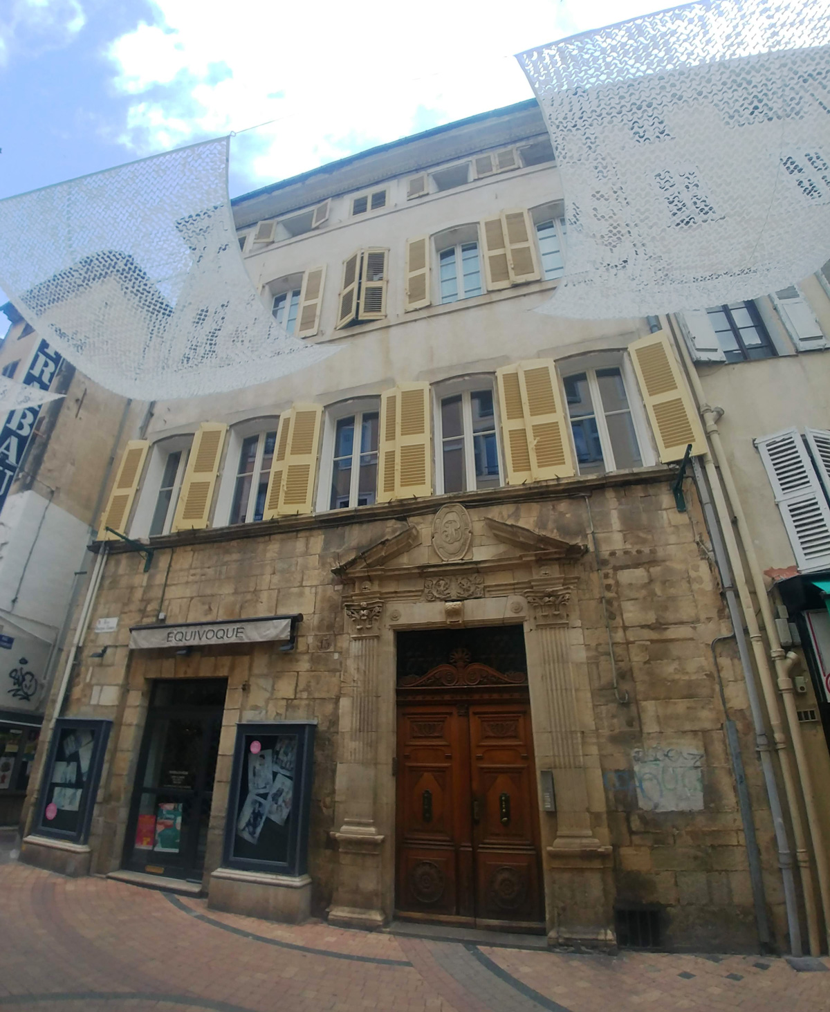 Façades. Sur le devant : l'étage-attique et l'avant-toit souligné par une frise. Sur le côté (rue du Combat) une génoise, plus rustique. Dans l'angle, une tête léonine rugissante, prise dans un disgracieux réseau technique de nôtre époque.