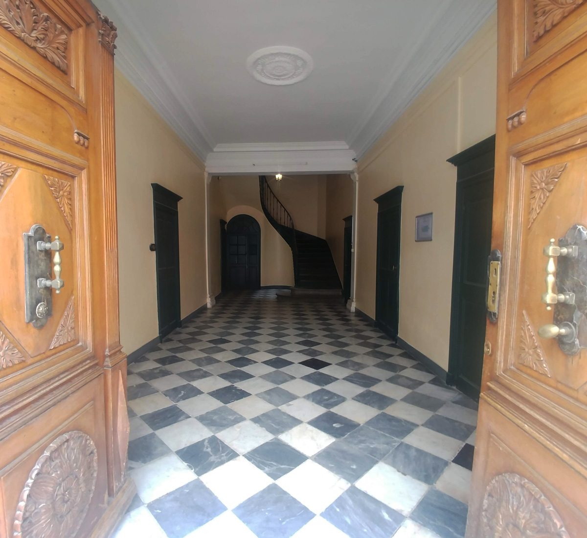 Vaste vestibule carrelé en damier. Escalier tournant suspendu.